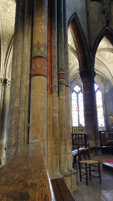 nous y pénétrons et découvrons ; la charpente apparente du 15ème siècle qui couvre la nef et le chœur, les colonnes peintes