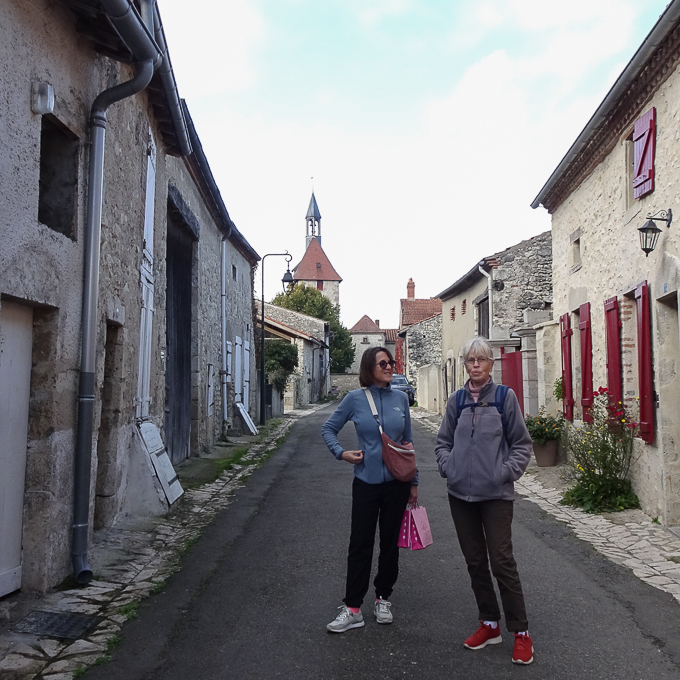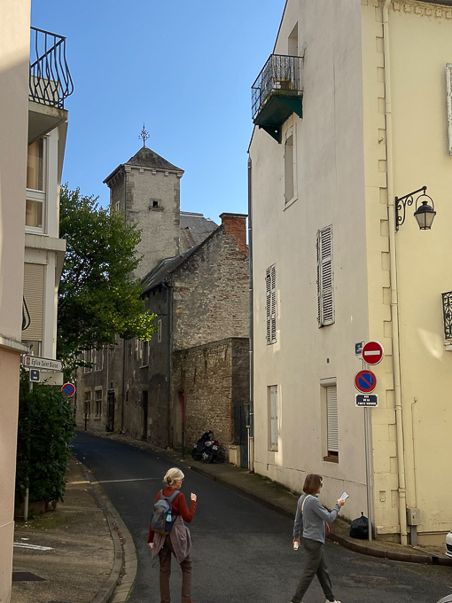 Magali et Simone dans la rue de la Paille sur fond de Tour de l’Horloge