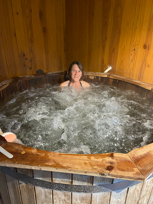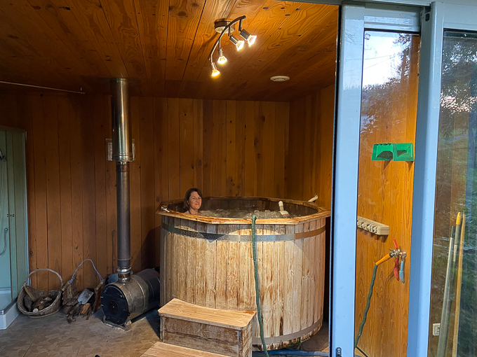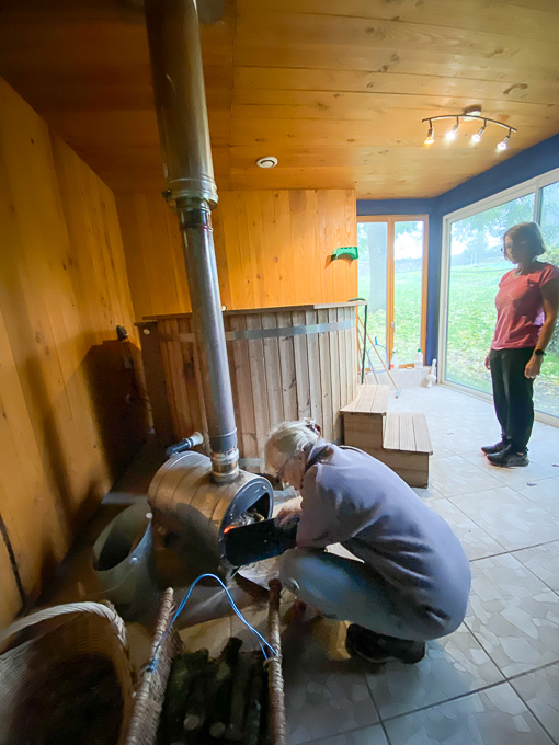 Dans l’annexe, il y a un sauna et un bain à remous, Magali veut en profiter mais le bassin est vide, tout est prévu pour le remplissage et le poële ne demande qu’a être allumé, c’est Simone qui s’en charge