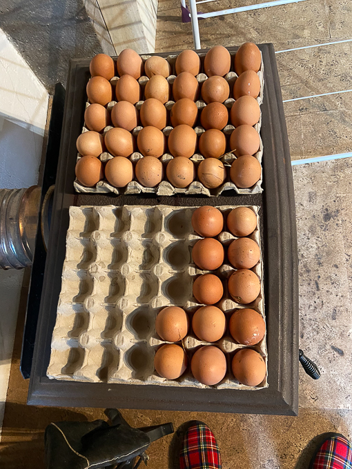 La récolte depuis dimanche, Magali prend un œuf à la coque tous les matins et je me fais une omelette de trois œufs, Simone les ramassent tous les soirs
