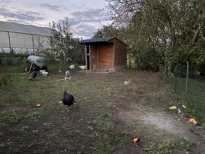 Nos hôtes partant au Maroc n’ayant personne pour rentrer la volaille dans le poulailler et ramasser les œufs le soir, nous demandent gentiment si on veut bien s’en occuper ; pas de problème !