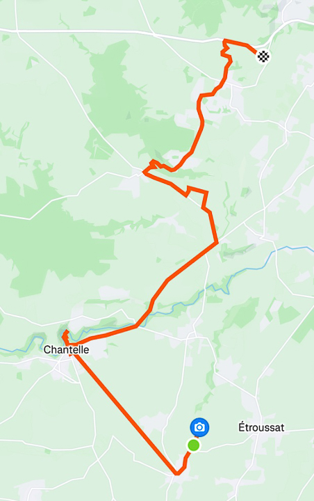 Notre dernière sortie, la météo prévoit de la pluie pour mardi toute la journée donc on avance notre départ de 24h. Simone improvise le trajet en fonction de son inspiration, sur la D141 près de Laféline (03)