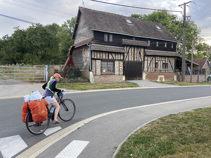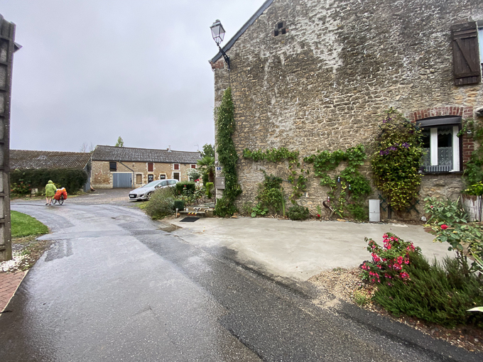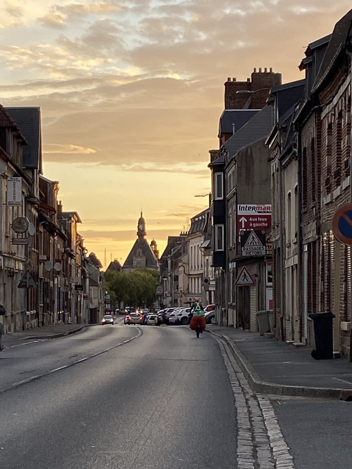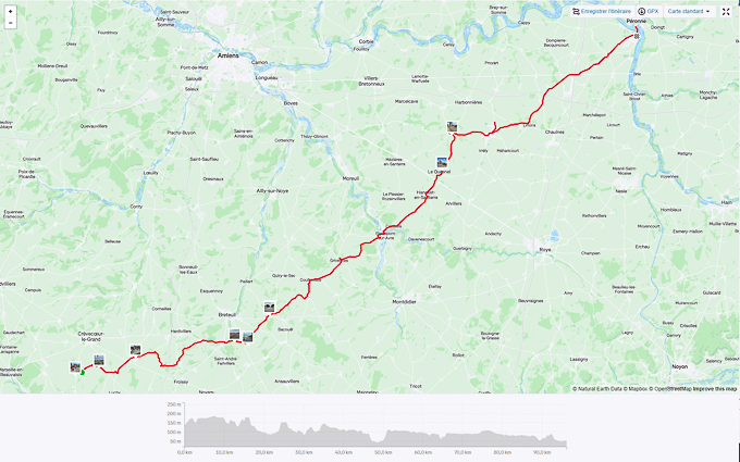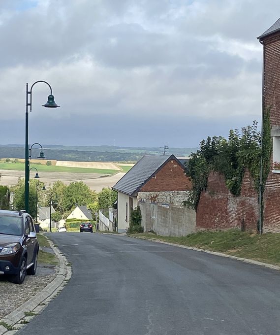 Les 18 derniers kms sur la D79, se décomposent en descente continue jusqu’à Barleux dans un paysage agricole où pas grand chose accroche l’oeil, un peu de relief à l’entrée de Péronne où se trouve notre chambre chez l’habitant, à l’entrée de Péronne au 40 route de Paris que nous ratons à cause de la confusion entre route de Paris et rue de Paris qui nous a fait visiter la ville