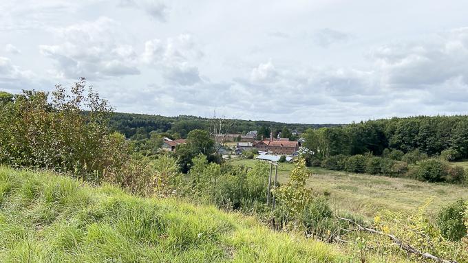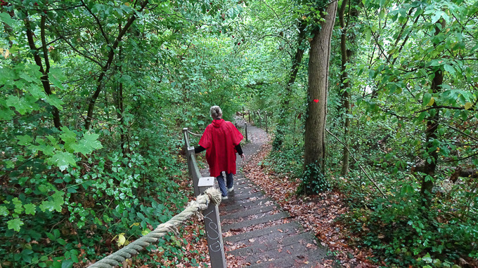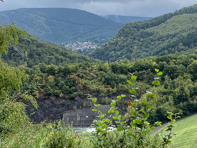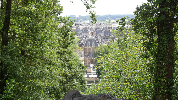 De Rocroi à Revin, 11 km de descente avec des pentes plus ou moins accentuées ! Nous arrivons à un point de vue au-dessus du bassin de Whitaker avec Revin en arrière-plan nichée dans la vallée de la Meuse