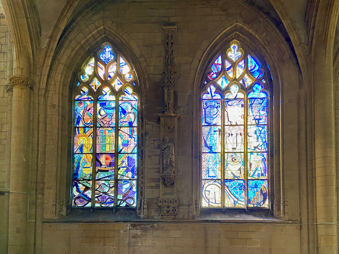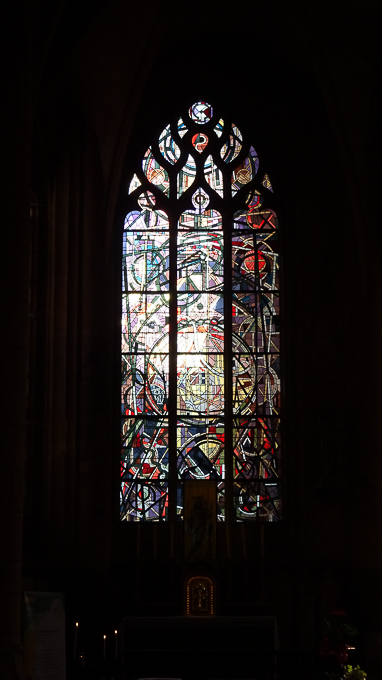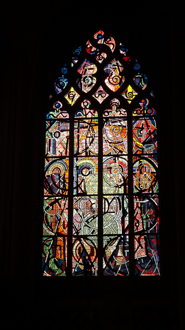 Entre temps le soleil a fait son apparition et les rayons traversent les magnifiques vitraux modernes réalisés par René Dürrbach, un ami de Picasso