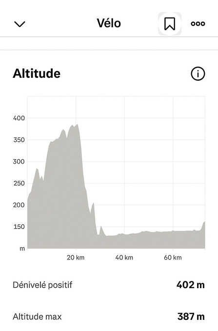 75.98 km, 402 m de D+ à 14,71 km/h, altitude max 387m.