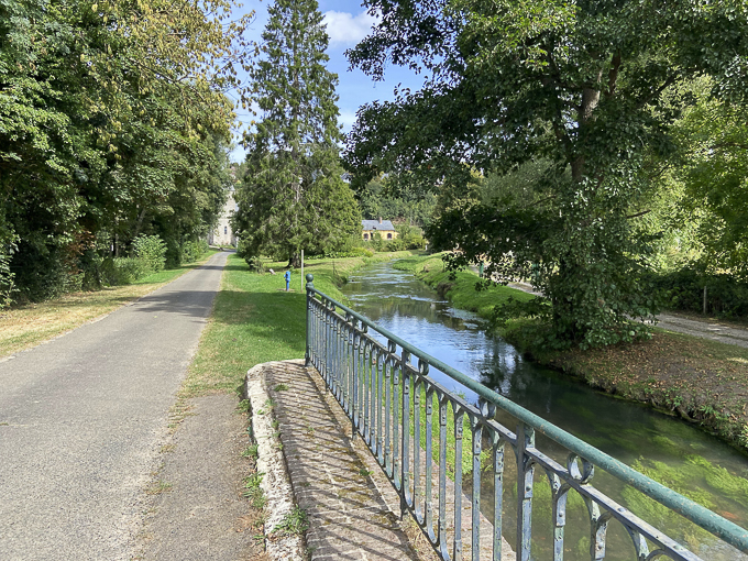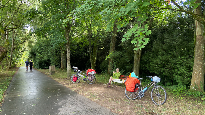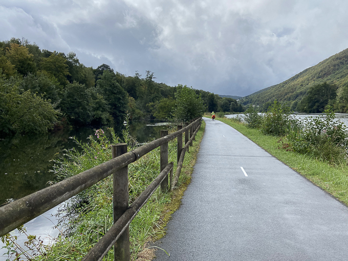 Nous grimpons dans la ville et partons à la recherche de la Voie Verte du bord de Meuse. En demandant notre chemin à un couple devant leur maison, le monsieur propose de nous montrer le chemin ! Du coup nous voilà partis derrière la voiture jusqu’à l’entrée de la piste ; rapide et efficace !!