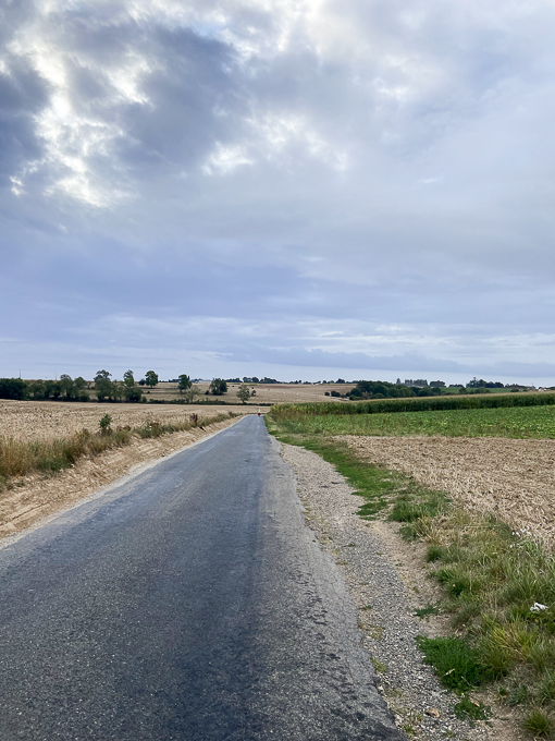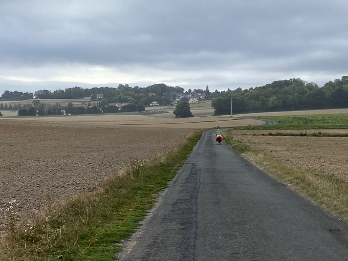 Entre Caply dans notre dos, et Beauvoir devant nous, une cycliste seule au monde, avance imperturbable, avec le clocher en ligne de mire
