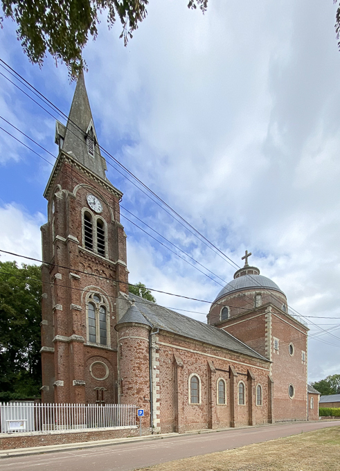 Le clocher qui flanque le côté gauche de la façade est construit en moellon à la base et aux angles, en brique pour la partie supérieure. Il est terminé par un toit en flèche recouvert d’ardoise