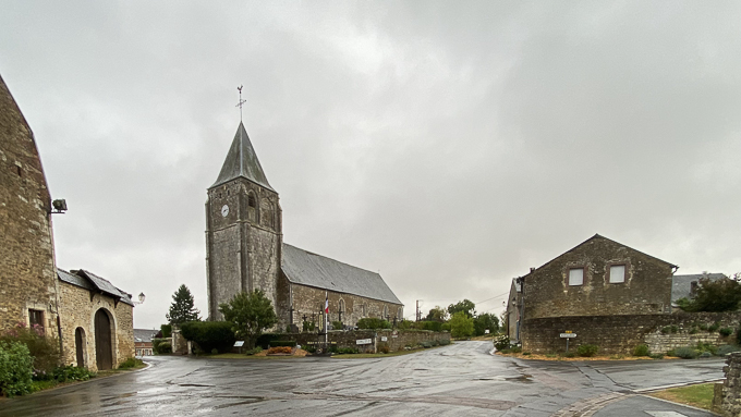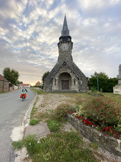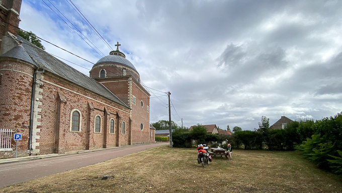 Nous sommes en manque de sucre ou de snacks sucrés, le banc près de l’église de Le Quesnel tombe à pic ; une Ricoré et des gâteaux secs font l’affaire, il faut bien que le réchaud camping gaz des années 70 servent !