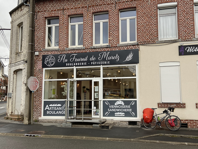 À la recherche d’un abri pour déjeuner, nous arrivons à Maretz avec l’intention de déjeuner sous le porche de l’église, il y a un boulanger à côté, des douceurs seraient la bienvenue par ce temps pourri. Simone m’appelle, le boulanger nous invite à pique-niquer dans le magasin !!! très sympathique de sa part, il nous offre même les 2 cafés