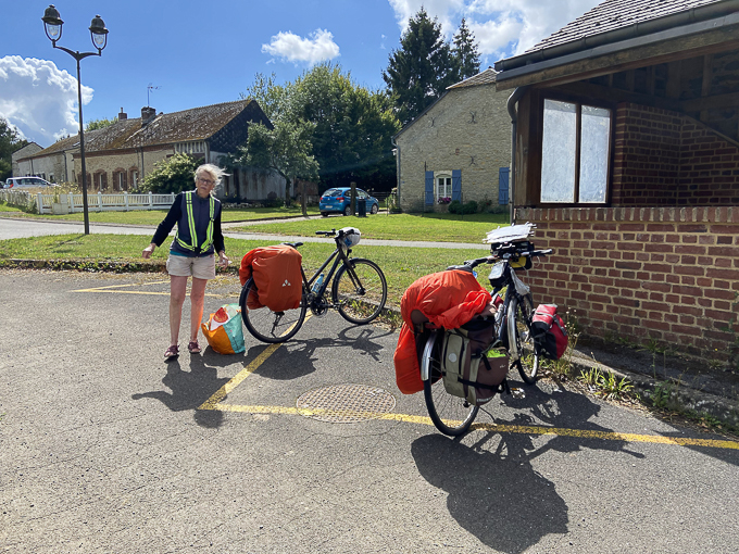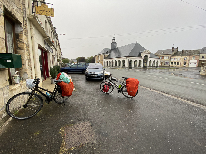 Premier arrêt chez le boulanger à Auvillers-les-Forges (08), Simone sort de la boulangerie les bras chargés ; pains, petits pains au chocolat et 2 éclairs à la vanille de quoi soutenir le moral qui ne fléchit pas malgré la météo.