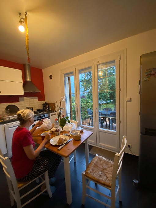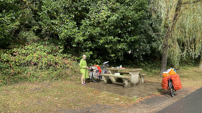 A la sortie de Ry (alt 75m), une table de pique-nique ; une invitation à s’arrêter et avaler le flan pour Simone et le croissant aux amandes pour moi
