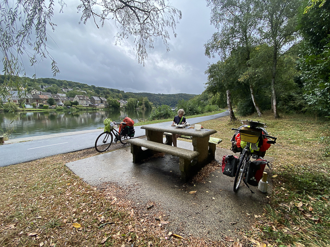 Enfin du soleil et une table de puique-nique sur la Trans-Ardennes en face de Monthermé (08), il est 12h17 tard pour nous, mais nous avons tenu (!) mais pas le soleil (!)