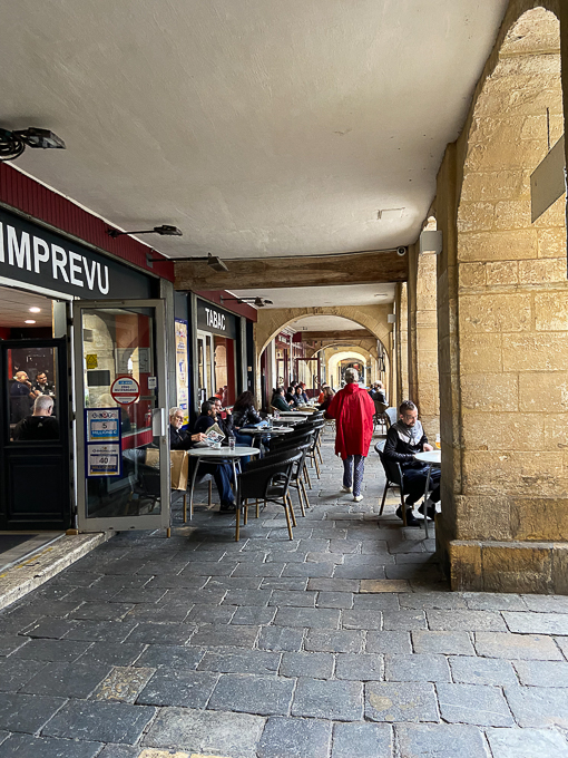 Sous les arcades, nous faisons le tour de la place à l’abri de la petite bruine. Simone scrute les cartes des restaurants, cherchant l’inspiration pour midi