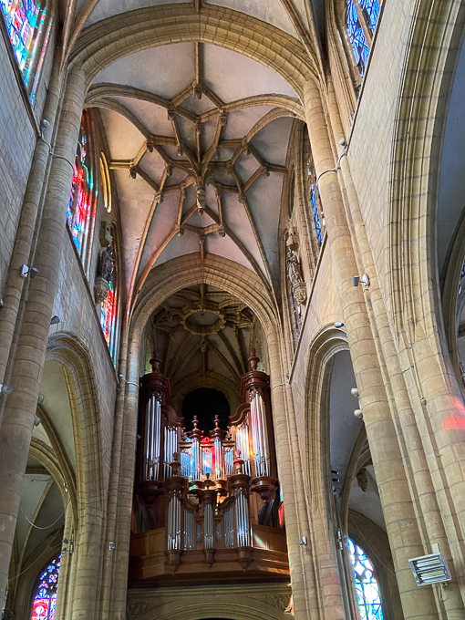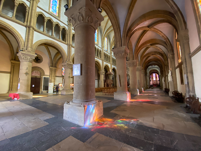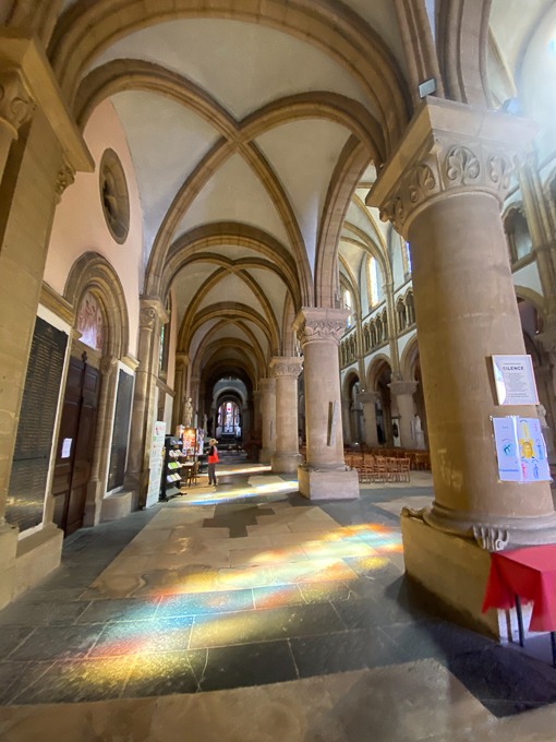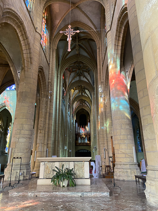 A l’intérieur de l’église St-Rémi, un spectacle féérique ; le soleil à travers les vitraux, inonde la nef de couleurs chatoyantes c’est fascinant, des tableaux