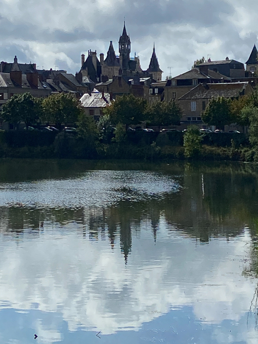 longeons la Meuse au pied des remparts, au-dessus desquels émerge le clocher de la basilique Notre-Dame-d’Espérance