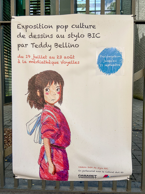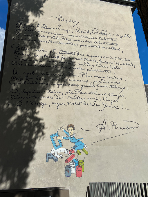 Dans la rue de l’Eglise, une affiche pour une exposition et une façade d’immeuble avec un texte d’Arthur Rimbaud, un poète français né le 20 octobre 1854 à Charleville (08) et mort le 10 novembre 1891 à Marseille (13).