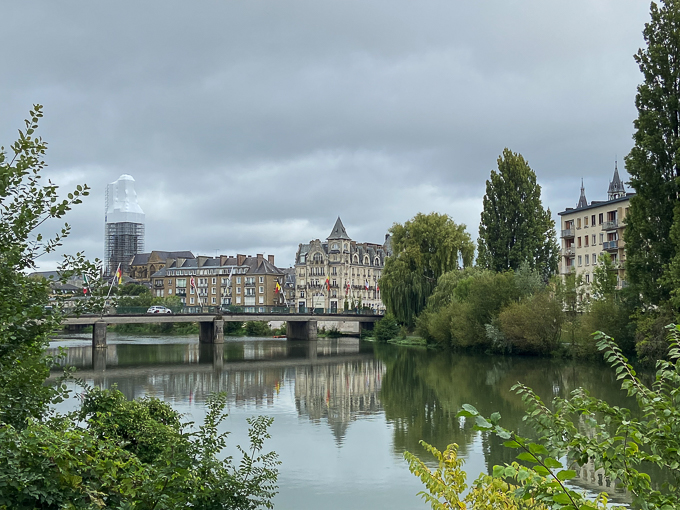 Nous filons vers Mézières, quai Albert 1er une vue sur le clocher de la basilique Notre-Dame-d’Espérance transformé en installation façon Cristo