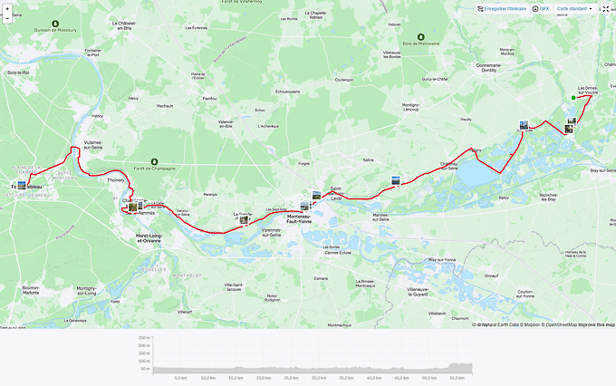 Lundi 8 septembre de Les-Ormes-sur-Voulzie à Fontainebleau une petite étape dans la vallée de la Seine, une étape relativement plate sur routes partagées et la voie cyclable « la Seine à Vélo »