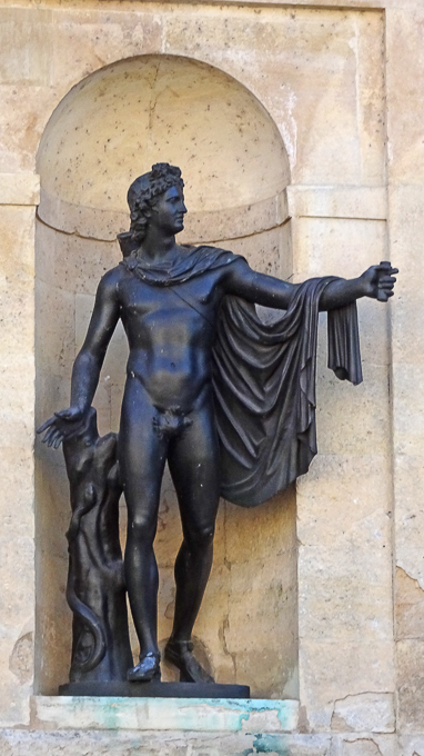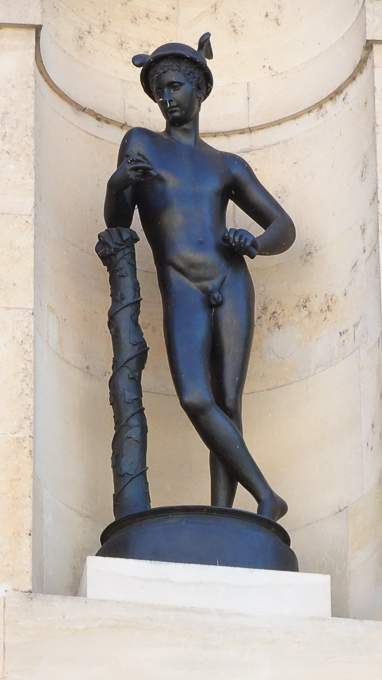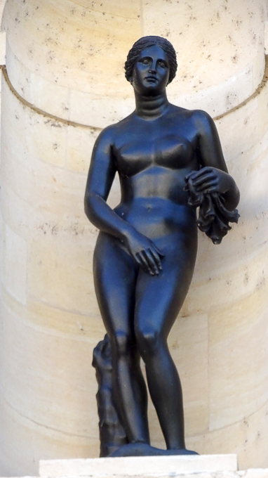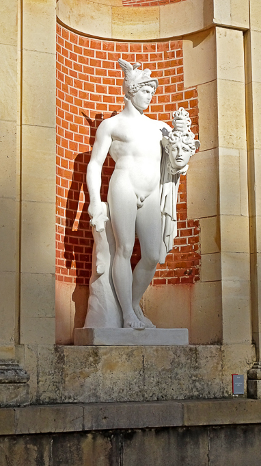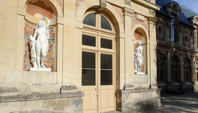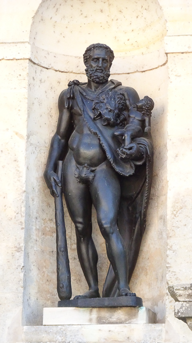 et entrons dans la cour de la Fontaine pour découvrir les sculptures, des grands bronzes à sujet mythologique, dans les niches de la façade de l’aile de la Belle Cheminée du château de Fontainebleau (77)