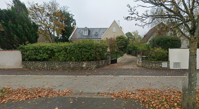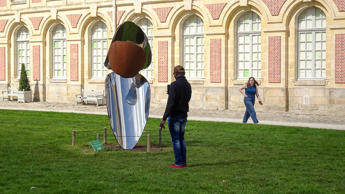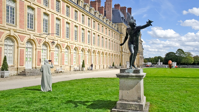 Simone arrive à la grille du château de Fontainebleau