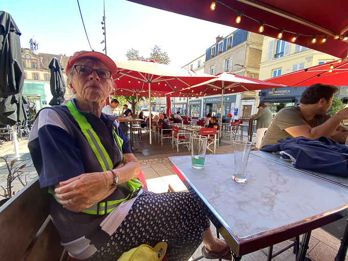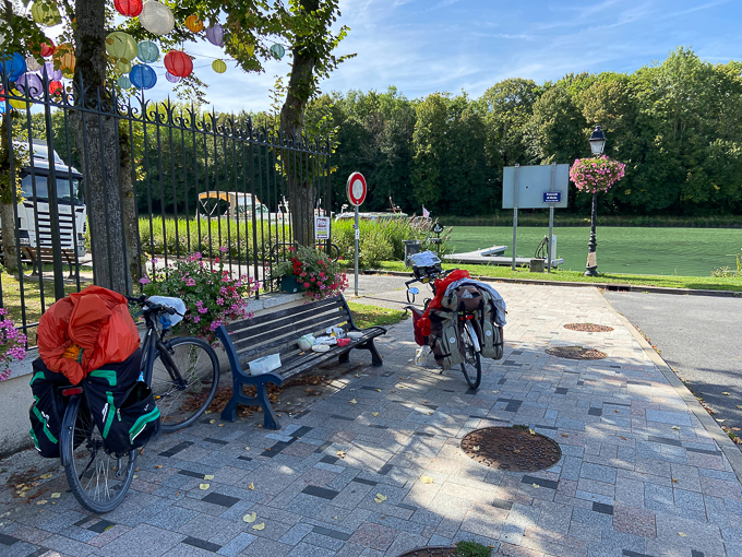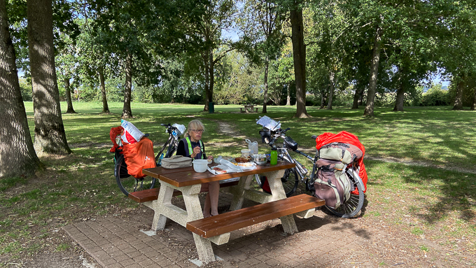 C’est l’heure du déjeuner à Mareuil-sur-Ay, nous profitons des commerces et du banc à côté du parc et du canal pour nous restaurer