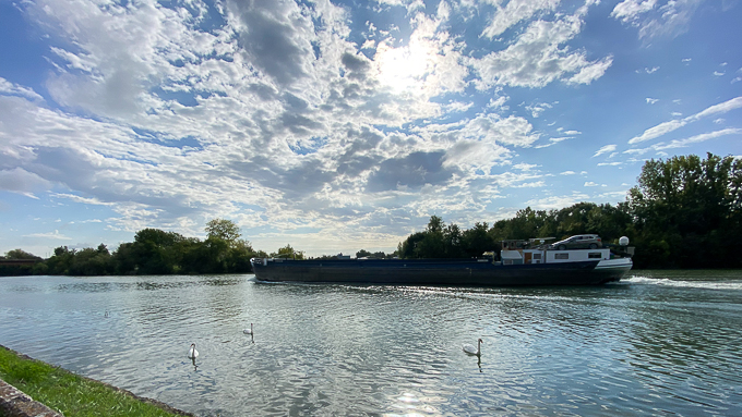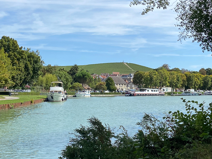 Gros cafouillage à Mareuil-sur-Ay, Simone demande le chemin à un commerçant qui nous envoie en arrière le long du canal. 2 km plus loin une intersection sans panneau de direction, un africain passe à vélo qui nous envoie dans la direction opposée celle d’où nous venons sur la même rive du canal, un couple de joggeur nous confirme les dires du cycliste et nous revoilà à Aÿ-Champagne (51) au bord du canal latéral à la Marne mais sur l’autre rive