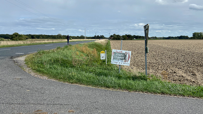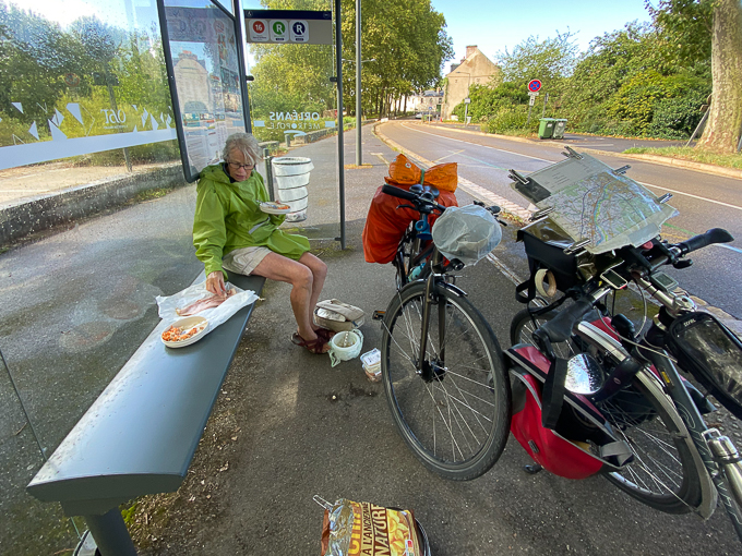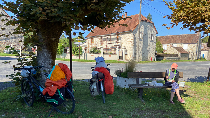 Beaucoup de vent de face sur cette plaine dénudée, depuis que nous avons quitté la forêt ! A Beauchamps-sur-Huillard (45) un petit repos récupérateur et sucré !