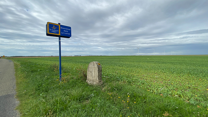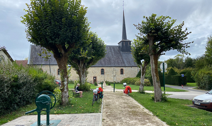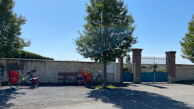 Maximum 6% pour les pentes sur notre parcours, pas trop difficile mais une dépense d’énergie et à partir de 11h le soleil est brûlant heureusement que j’ai mon chapeau (!), l’arrêt déjeuner s’impose et à Louan-Villegruis-Fontaine (51), nous trouvons juste un banc mais pas de table
