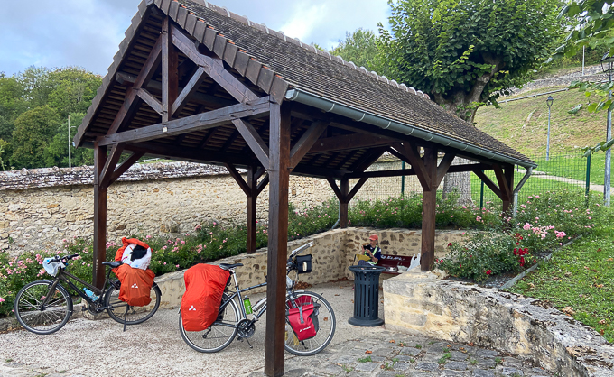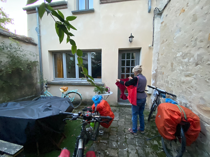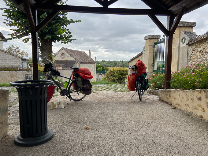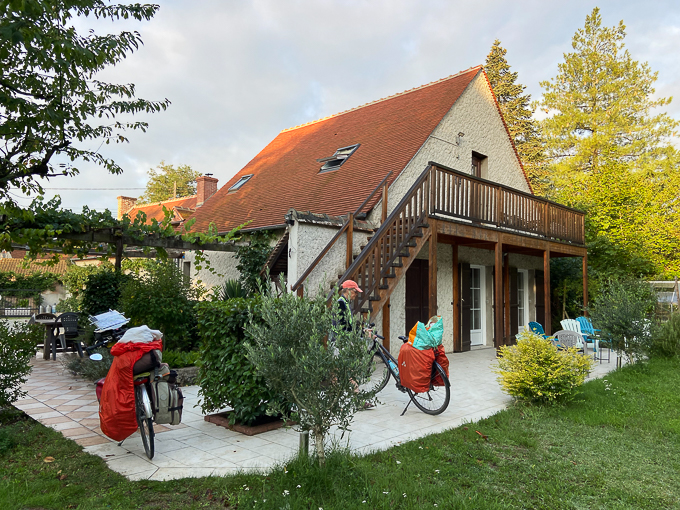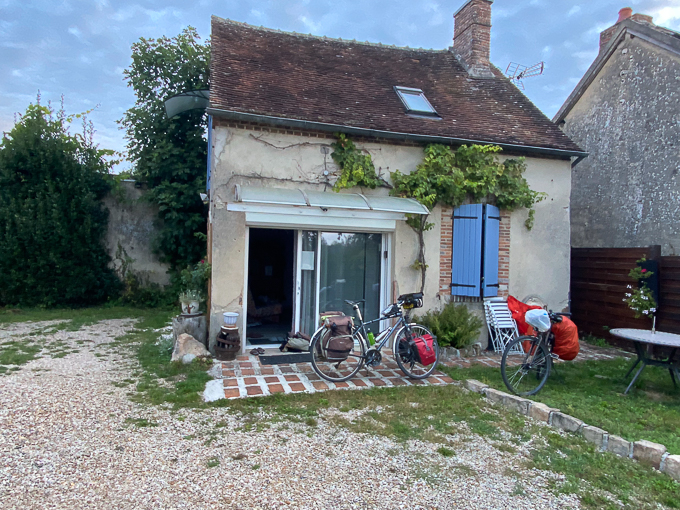 À l’arrivée à la chambre d’hôtes de Germigny-les-Prés un peu avant 17h, nous découvrons un portail fermé et un écriteau « ouverture à 17h », le ton est donné ! Nous poireautons le temps que quelqu’un ouvre le portail, nous sommes accueillis par madame. Une remise attend nos vélos pour la nuit, ils seront à l’abri de la pluie