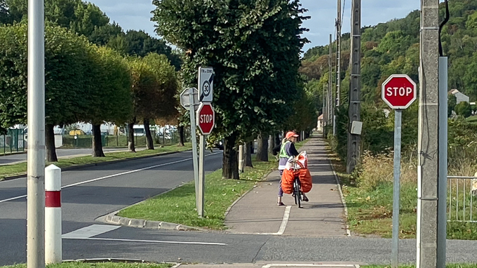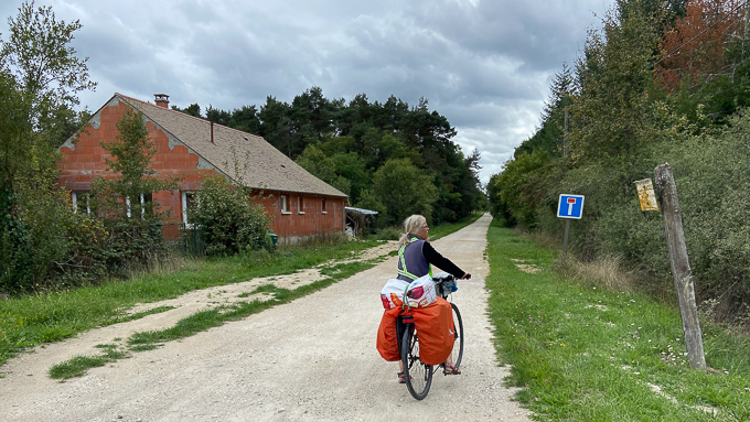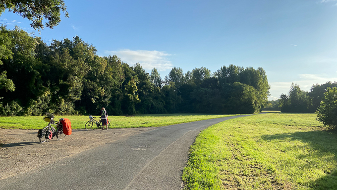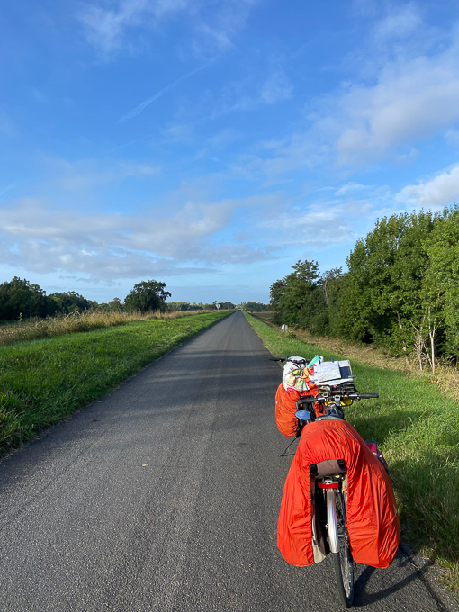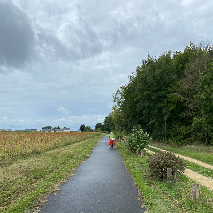 Simone près de St-Jean-le-Blanc (45) met son chargement à l’abri, tandis que j’admire le serpent « La Loire à Vélo » et ses ondulations fendant la verdure
