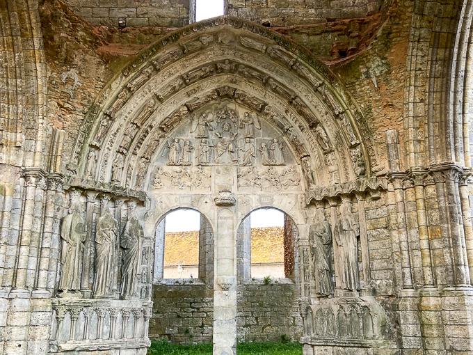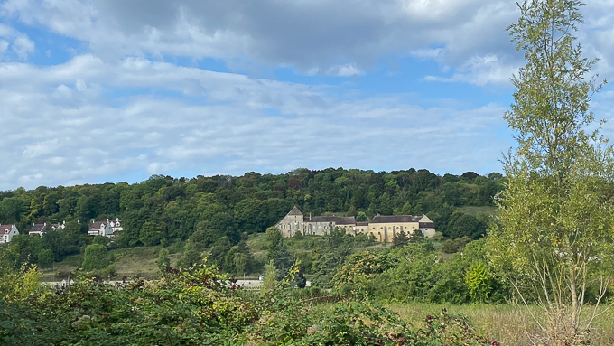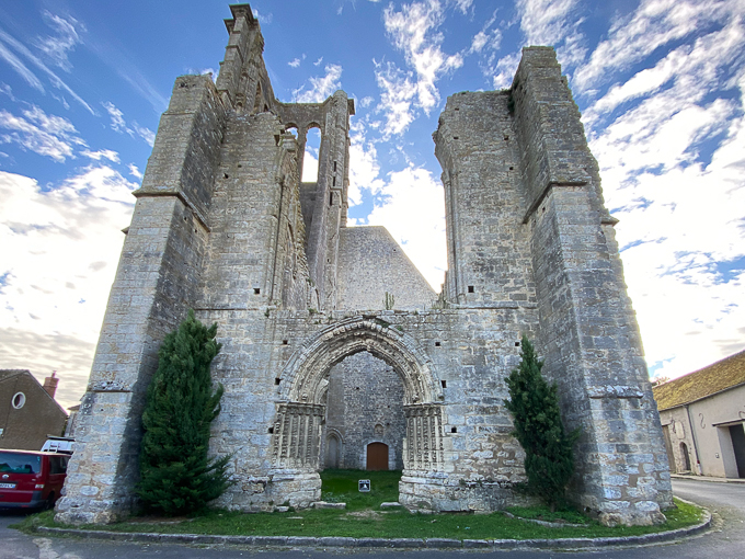 La sortie de la ville est très aisée et rapide, nous prenons la D58 dans la forêt de Fontainebleau jusqu’à Bourron- Marlotte, puis de petites départementales blanches sur la carte IGN jusqu’à Larchant, un village du parc naturel régional du Gâtinais français. Sur la place du Pilori, nous découvrons les vestiges de la basilique St-Mathurin accolés à la partie restaurée et utilisée comme lieu de culte