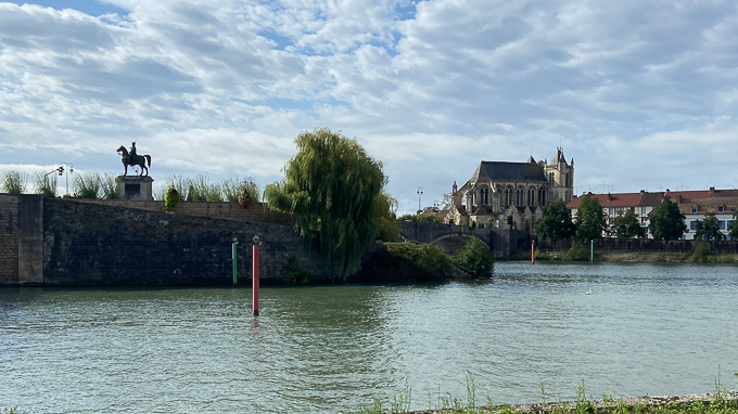 la statue équestre de Napoléon à la confluence de l’Yonne et de la Seine, la collégiale Notre-Dame-et-St-Loup de Montereau-Fault-Yonne sur l’autre rive