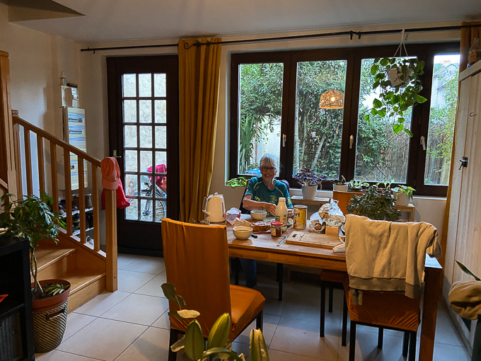Toute la maison dort encore lorsque à 7h nous commençons notre petit déjeuner. avant la fin Yves nous rejoint puis Nicole. Pas question de faire la vaisselle, Yves range tout dans le lave-vaisselle.
