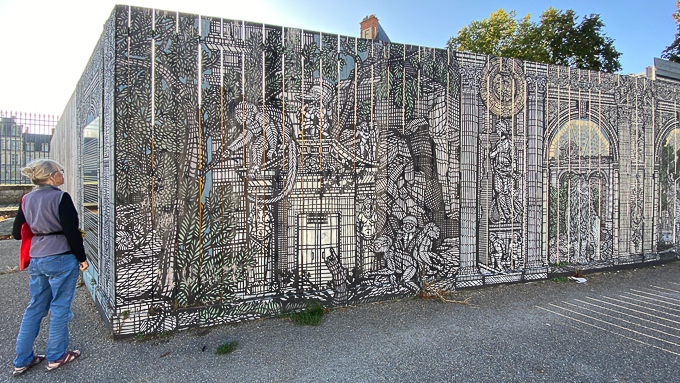 Un cache misère de chantier en œuvre d’art « La Mémoire des pierres » de Monkey Bird, à l’entrée du château étonne Simone par sa taille et la finesse des détails