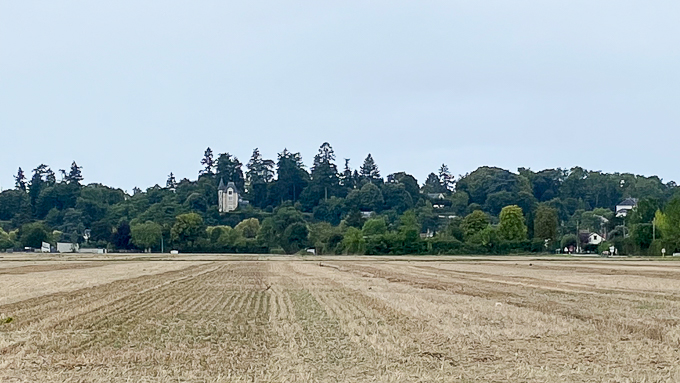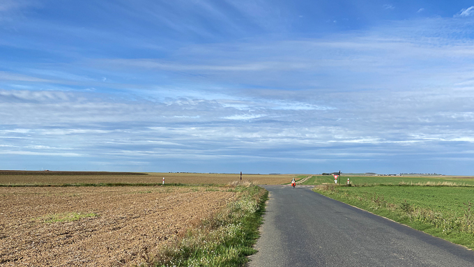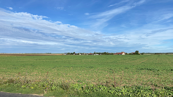 Après Larchant, après avoir traversé un carrière sur la D52, une descente suivie d’une belle montée, le paysage change ; de vastes champs succèdent à la forêt, un paysage de culture de céréales et d’oléoprotéagineux en approchant de Chevrainvilliers (77)