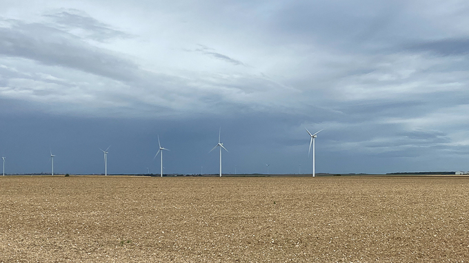 sur la D141 près de Sceaux-du-Gâtinais (45), les éoliennes succèdent à la forêt