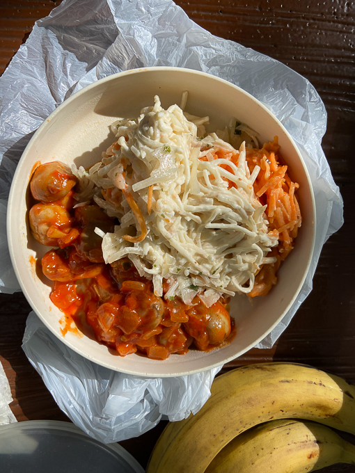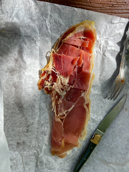 sur l’aire de pique-nique à Chailles (41), les salades du Lidl et les champignons à la grecque, le jambon du marché de Fontainbleau