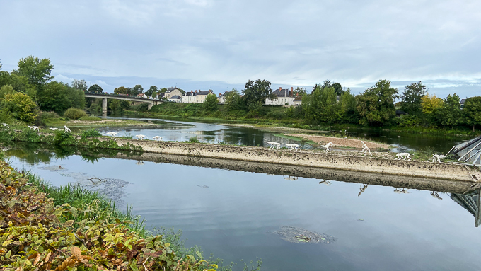 L’artiste T. Leo a investi pour un mois la retenue sur le Cher à Savonnières. Incarnation fantasmagorique des gargouilles en pierre des cathédrales, une meute de chiens faméliques détale sur le barrage au-dessus du Cher. Mi-chien, mi-loup, mi-varan, mi-lézard… Des créatures expressives, dont l’attitude de fuite crée un sentiment de malaise. A quel danger tentent-elles d’échapper ?… Après quoi courent-elles ainsi ?… Une mise en scène très réussie !!