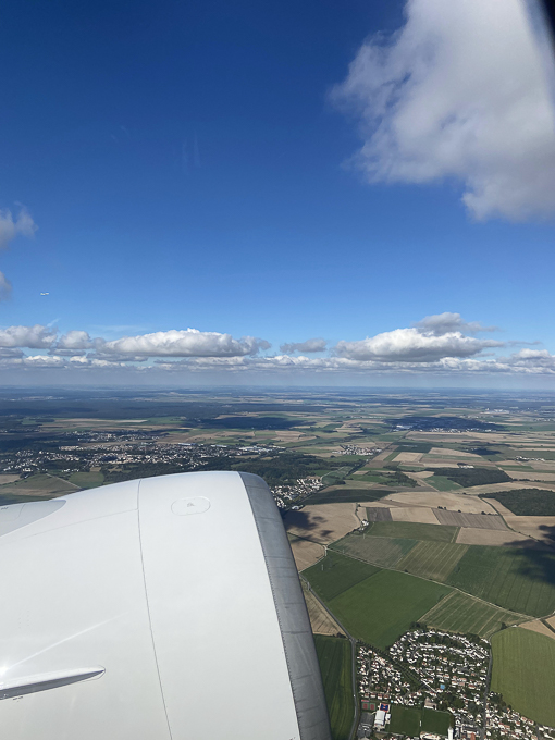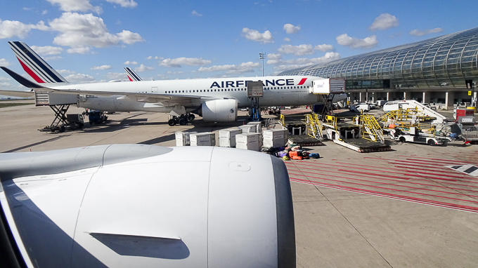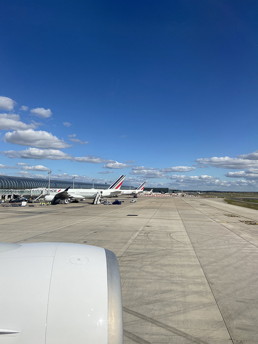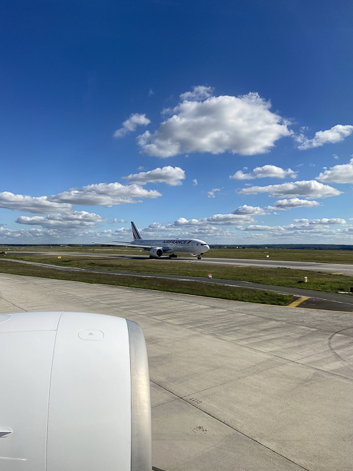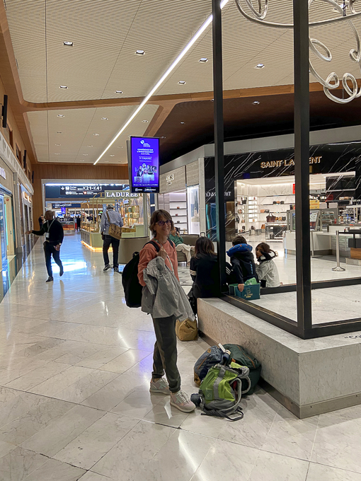 Le lendemain, tout le monde est frais et pimpan surtout après le petit déjeuner à « la Terrasse ». Le départ est à 13h30 du terminal 2E, la fin d’enregistrement est à 12h30. A 10h nous sommes au VAL, afin d’éviter la cohue à la dépose des valises et à la zone de contrôle de sécurité. A 11h15, nous voilà dans la zone d’embarquement, Simone décompresse et j’en profite pour une photo de Magali dans l’aérogare