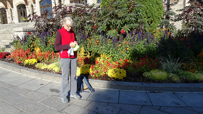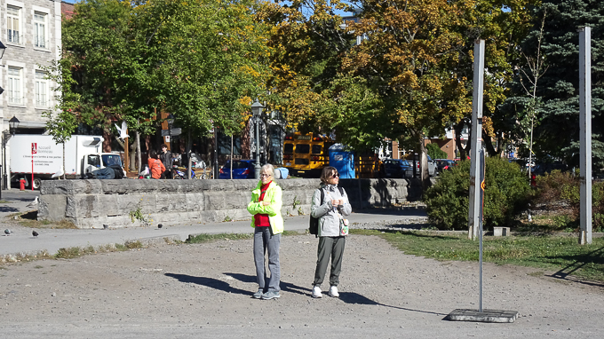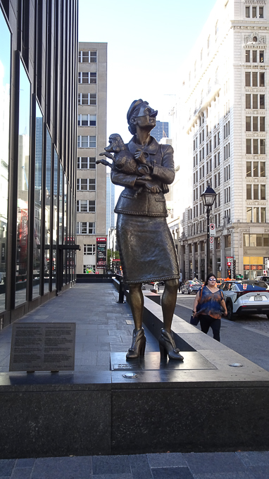 La femme au tailleur Chanel regarde avec dédain le siège social de la Banque de Montréal, pendant que le carlin anglais et son maître affichent une attitude hautaine en direction de la Basilique Notre-Dame.