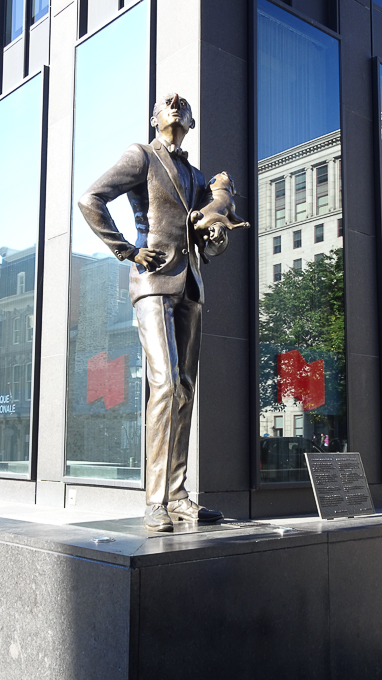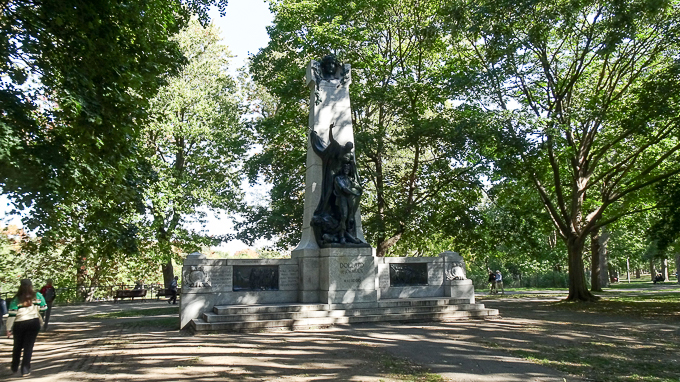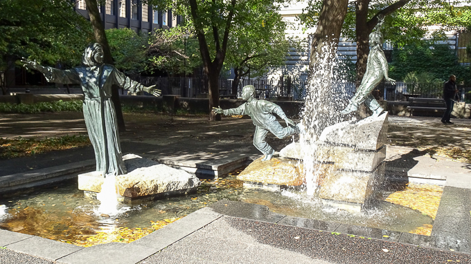 Devant nous le parc La Fontaine, un peu d’ombre nous fera du bien, à l’entrée, la statue du Sieur Adam Daulac des Ormeaux, dit de Dollard des Ormeaux les bronzes sont de Alfred Laliberté