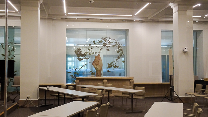 « Tenir en équilibre » s’incarne par la sculpture d’un personnage féminin dont le corps se tient à l’horizontale dans l’espace, en équilibre sur sa main appuyée au bout d’un mât d’aluminium. Ce tableau évoque la virtuosité de la danse contemporaine. De plus, l’apesanteur du corps, la jupe en crinoline et la démesure de la main d’appui du personnage, contrastant avec le traitement réaliste des autres éléments, réfèrent également à la fantaisie de la bande dessinée.