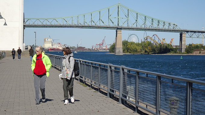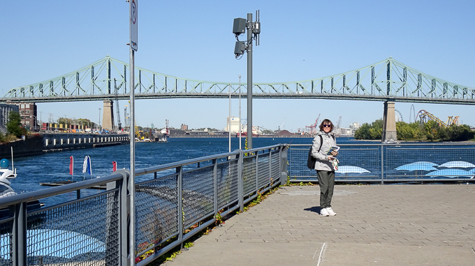 toujours sur le Quai de l’Horloge, Magali et en arrière plan le pont Jacques-Cartier sur le fleuve St-Laurent