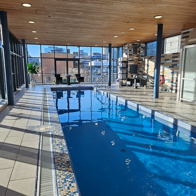 Au retour à l’hôtel, pour se délasser Magali profite de la piscine de l’hôtel, elle a le bassin pour elle toute seule, il est situé au 10ème étage