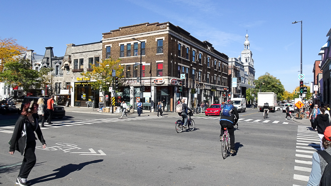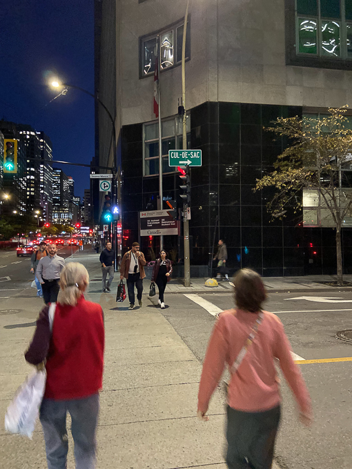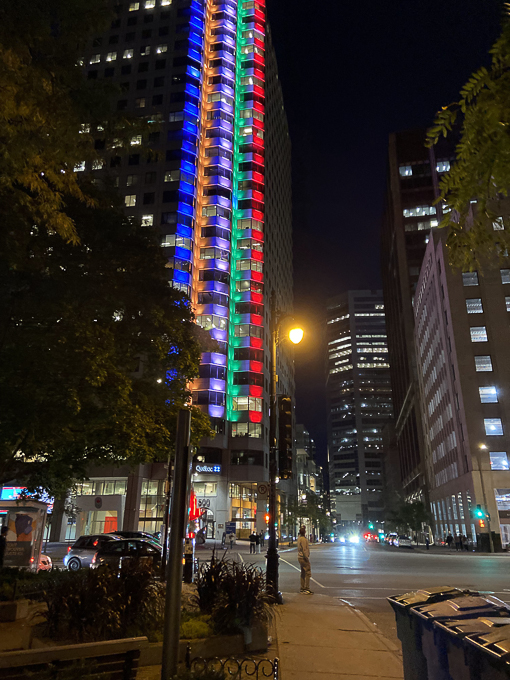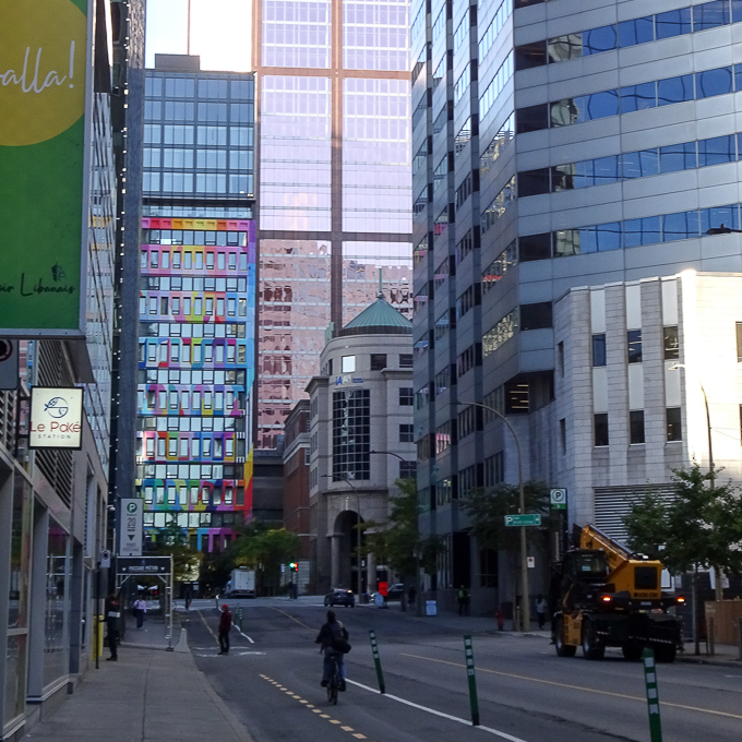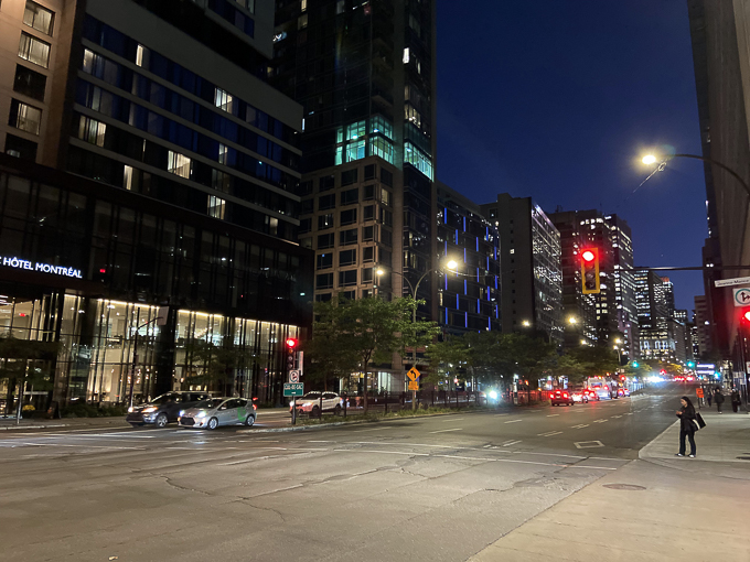 Nous sortons repérer les environs de l’hôtel, 19h à l’intersection de la rue Jeanne-Mance et le boulevard René-Lévesque