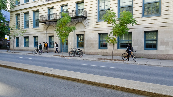 les parking vélos devant l’École primaire et secondaire F.A.C.E. rue University à Montréal