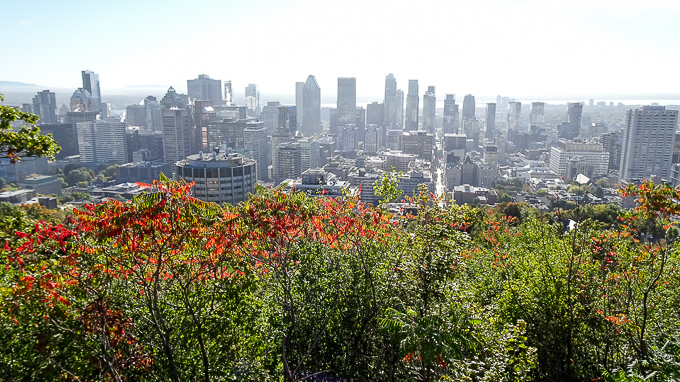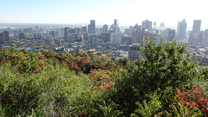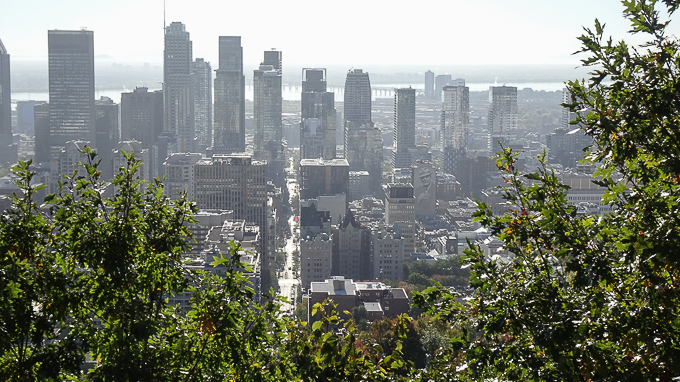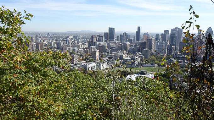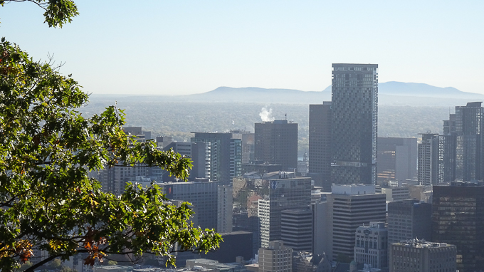 Midi approchant, nous commençons la descente vers la ville, au belvédère Camillien-Houde, la vue vers l’Est ; Montréal et le Mont Bruno à l’arrière plan