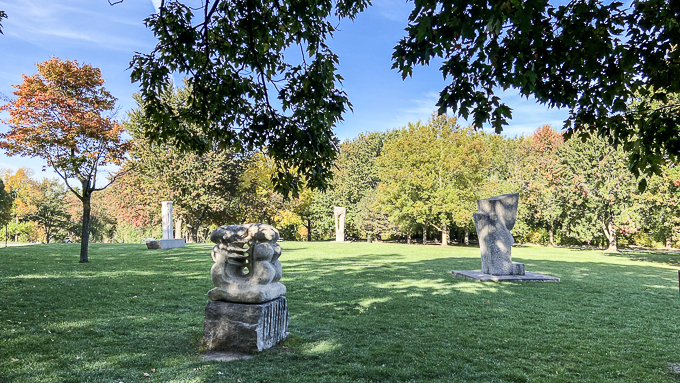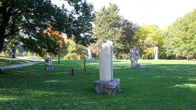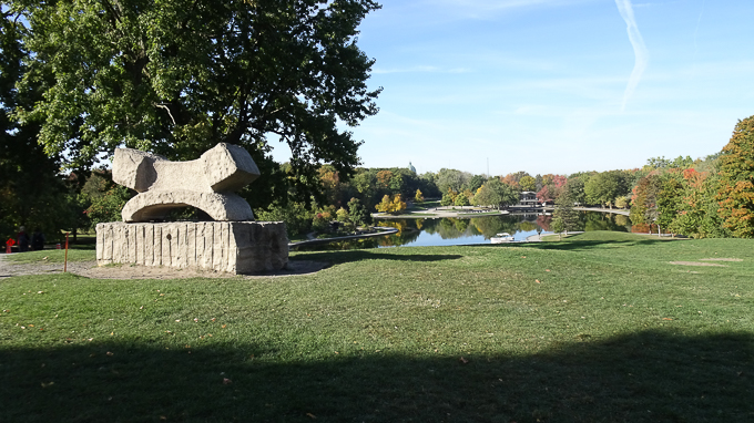 Magali a prévu une randonnée dans le parc du Mont-Royal, nous partons en direction du lac aux castors et découvrons, disséminées sur la pelouse, des sculptures ;